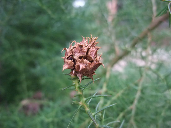 Anecdote : Le feuillage est une forme de jeunesse (il conserve à l’âge adulte des spécificités de feuillage de très jeunes plantes). Les feuilles de l'espèce type sont plus courtes et recourbées vers le rameau (en forme d’alènes)