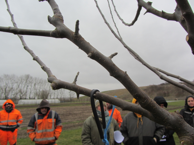 Formation pratique aux techniques de taille permettant de conduire de jeunes arbres fruitiers pour améliorer la fructification. Taille au sécateur et à la scie réalisée directement sur des jeunes arbres.